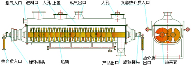 空心轴上密集排列着楔型中空桨叶,热介质经空心轴流经桨叶。单位有效容积内传热面积很大,热介质温度从-40℃到320℃,可以是水蒸汽,也可以是液体介质:如冰盐水、热水、导热油等。间接传导加热,热量主要用来加热物料,使用极少量空气带走湿气,热量损失仅为通过器体保温层向环境的散热,以及少量尾气携带的热量。相互齿合的楔型桨叶之间具有互相清洁功能;而物料颗粒与楔型面的相对运动产生洗刷作用,能够洗刷掉楔型面上附着物料,使运转中一直保持着清洁的传热面。